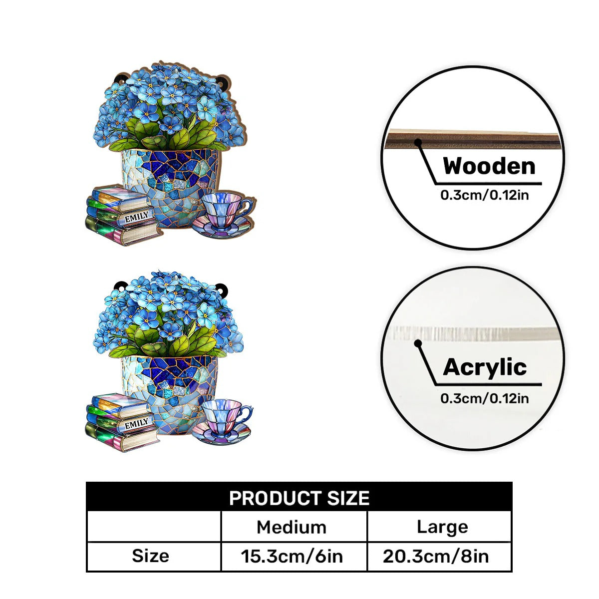 Add a touch of timeless beauty to your home with our Personalized Tulip Vase & Books Stained Glass Suncatcher. Featuring vibrant stained glass-style tulips in a colorful vase, stacked books, and a charming teacup, this stunning window décor can be customized with your name (or a loved one’s) printed on the book, making it a truly unique keepsake.