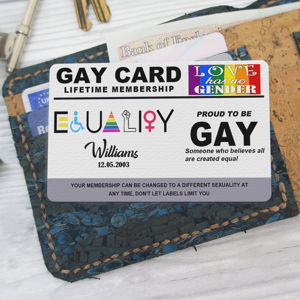 Crafted from durable, high-quality material, this LGBTQ+ wallet card fits perfectly in standard credit card slots, so you can carry your pride and values with you every day. It also makes a heartfelt gift for friends, family, and loved ones during Pride Month, birthdays, anniversaries, or coming-out celebrations.Carry a daily reminder of who you are and what you stand for with this custom LGBTQ+ equality wallet card. Order today and celebrate love without limits!