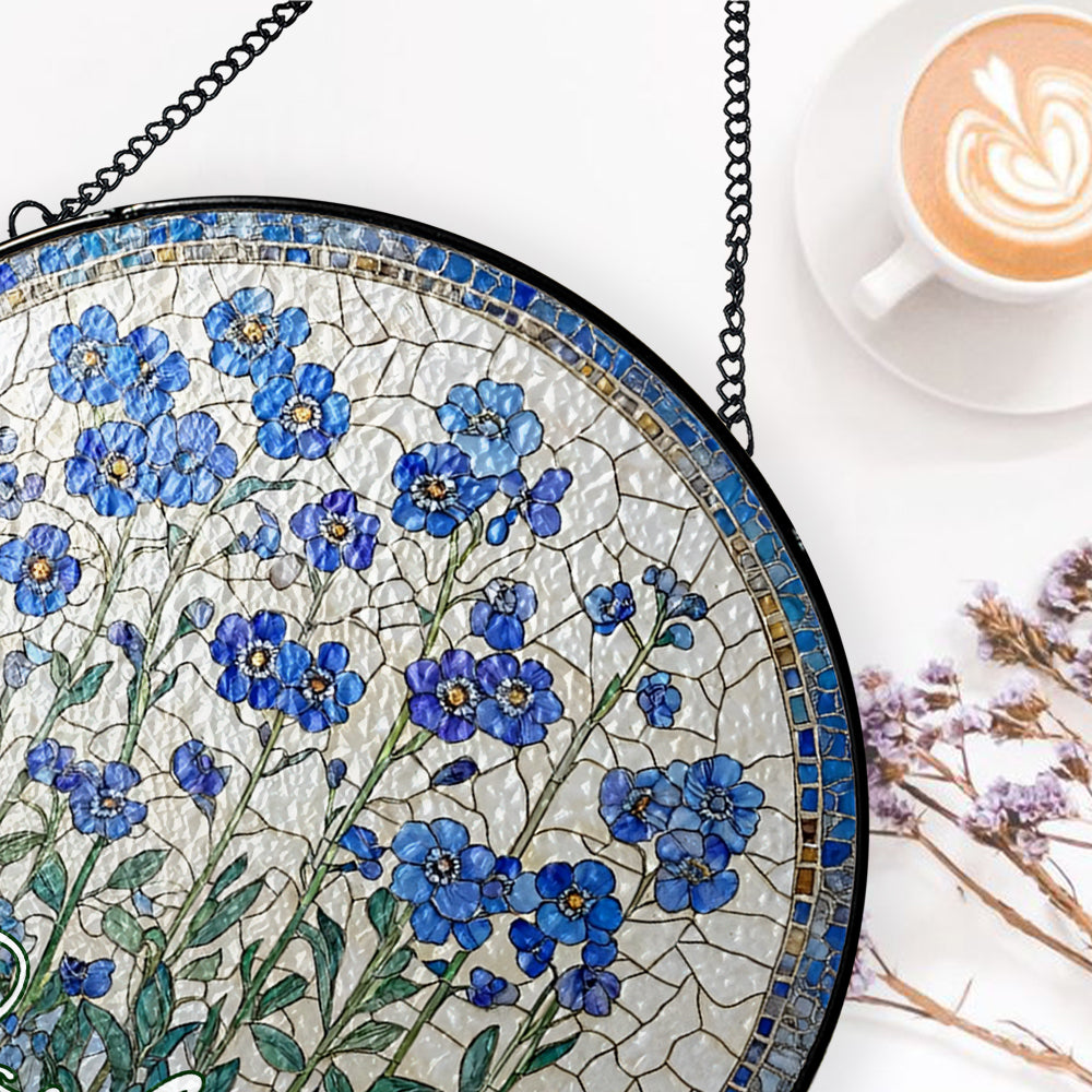 Bring the delicate beauty of nature into your home with our Personalized Stained Glass Suncatcher. Featuring an elegant arrangement of blooming blue flowers in a stunning mosaic-style design, this charming piece can be customized with your name for a personal and meaningful touch.