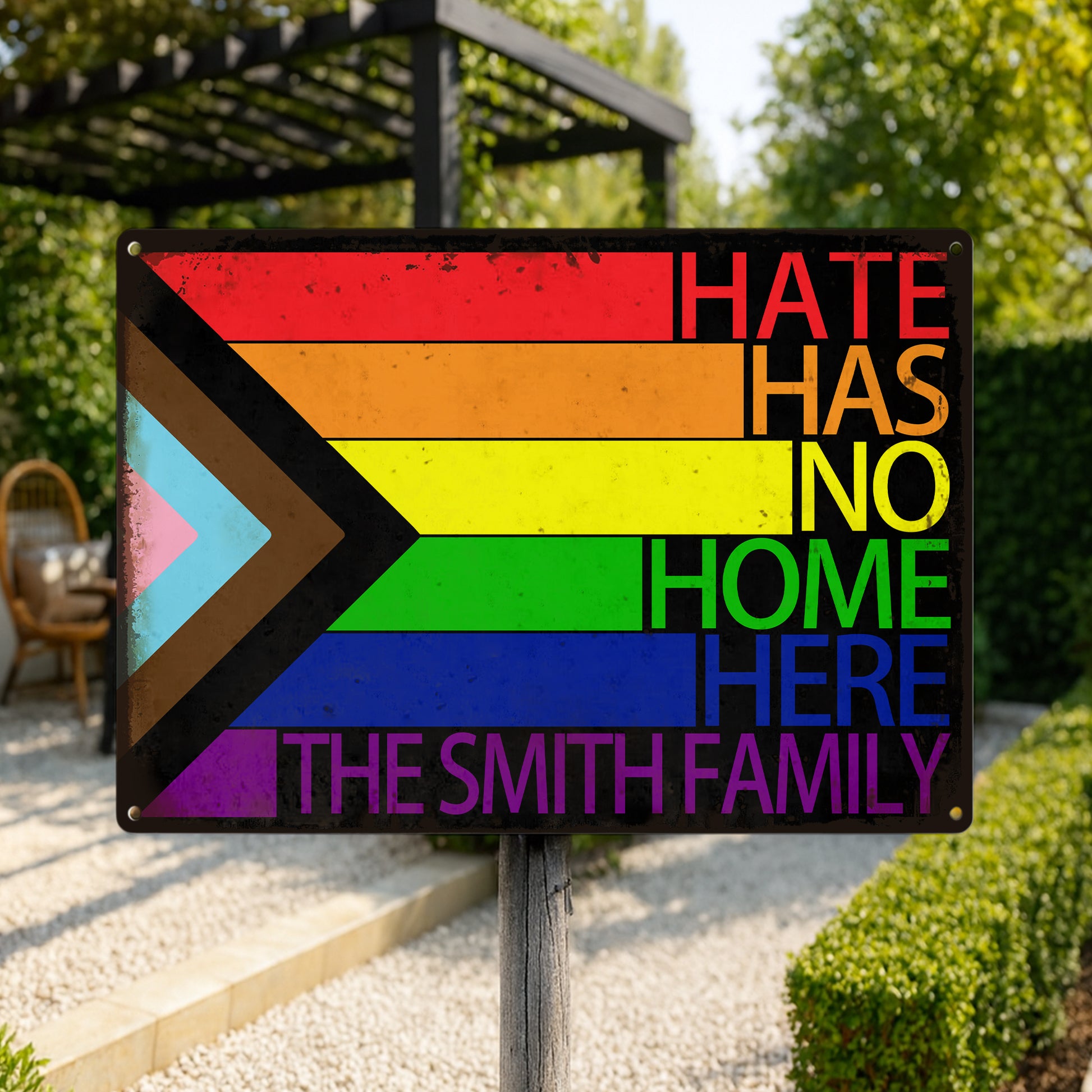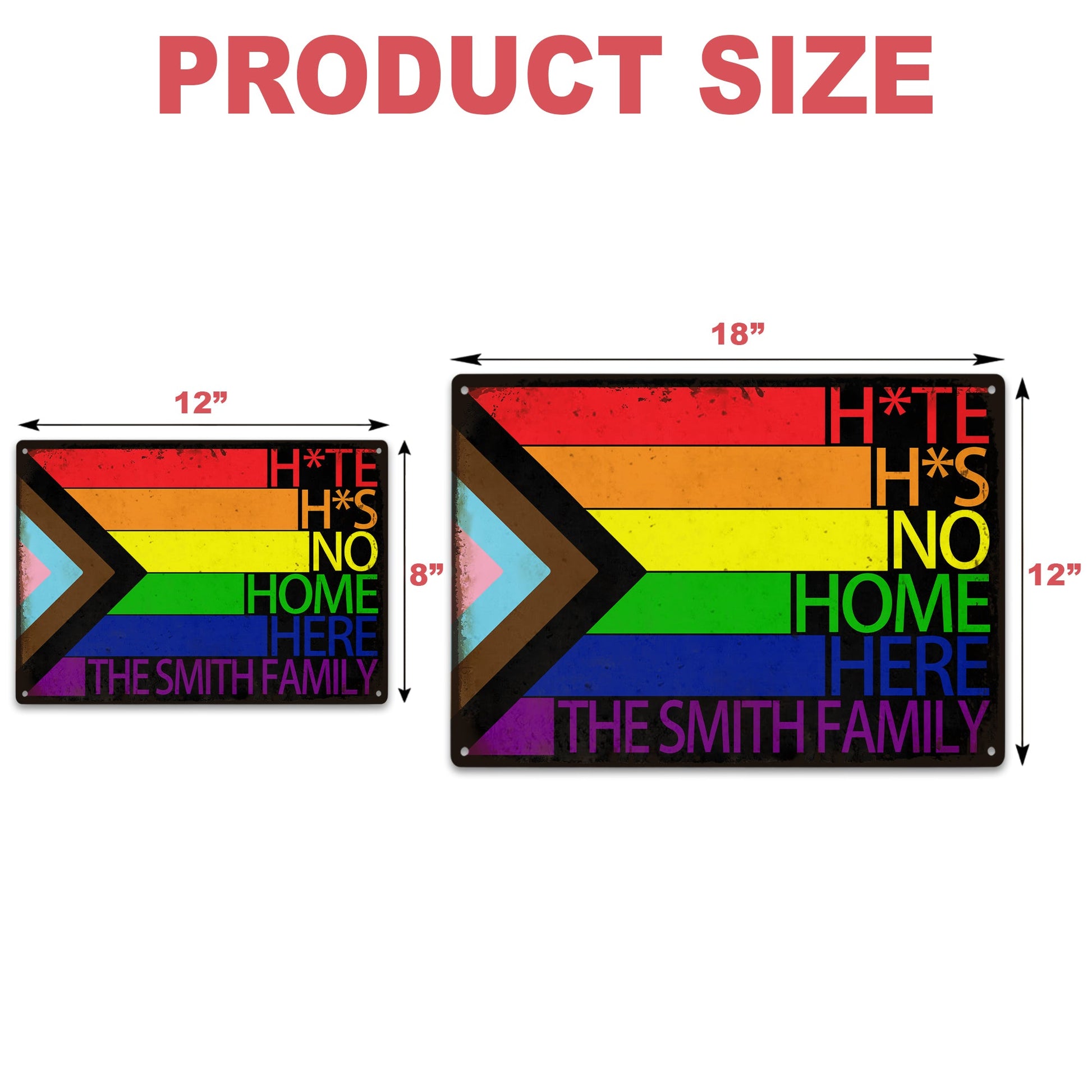 Show your pride and promote inclusion with this vibrant “Hate Has No Home Here” personalized metal sign. Made from heavy-duty aluminum, it's perfect for both indoor and outdoor use. Featuring a rainbow heart, colorful floral art, and your custom family name, this sign makes a bold statement of love, unity, and LGBTQ+ support. Pre-drilled holes make it easy to hang on your porch, garden fence, entryway, or home wall. A thoughtful gift or empowering decor piece for any home that believes in kindness and equality.