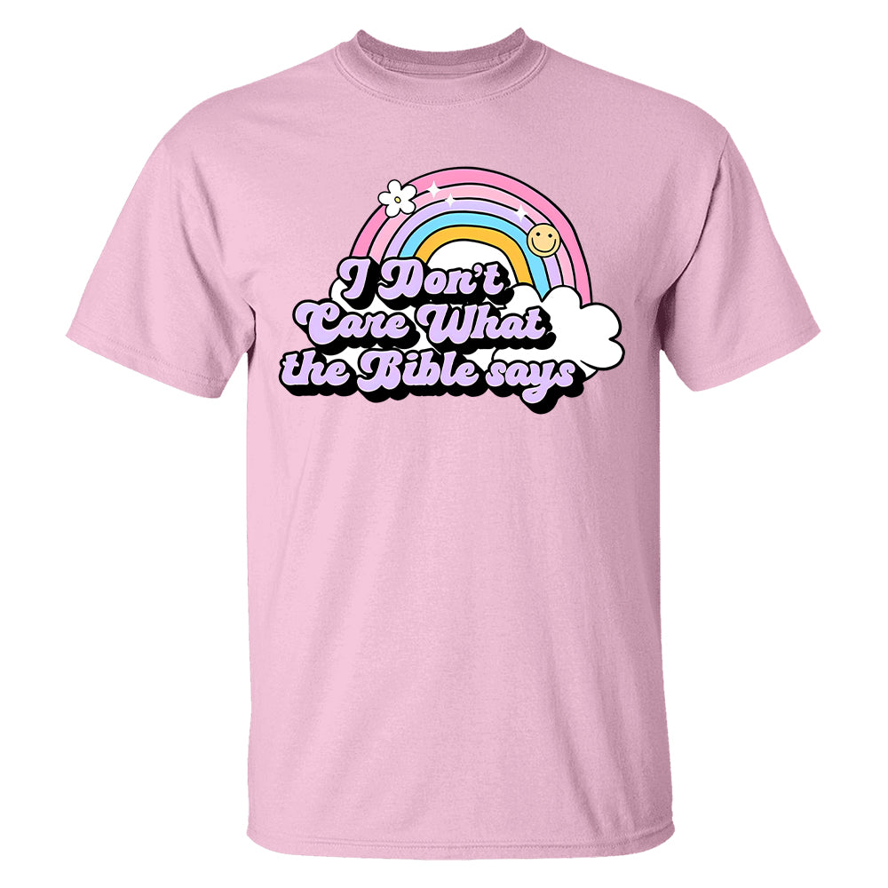 Make a bold, unapologetic statement with our "I Don’t Care What the Bible Says" Rainbow Tee — where playful design meets fierce self-expression. Featuring a vibrant retro rainbow, smiley face, and bubbly pastel typography, this shirt is perfect for anyone proud to live their truth, loud and proud. Printed on a soft, high-quality cotton tee, it’s as comfortable as it is empowering. Whether you're out celebrating pride, hanging with friends, or just making your stance known — this shirt says it all.