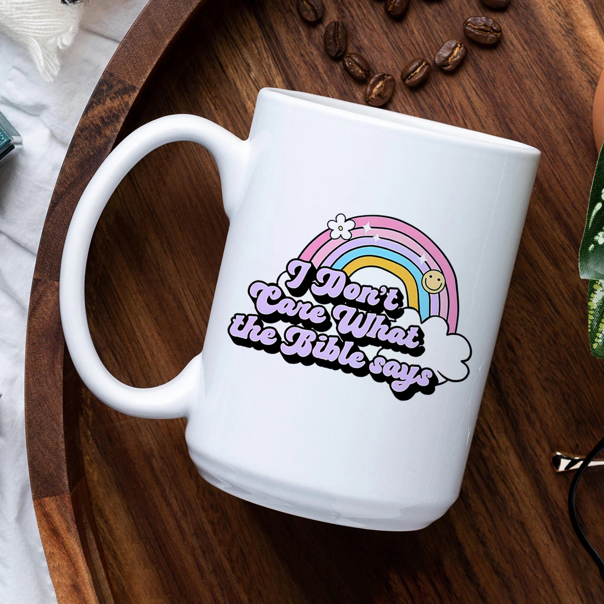 This Pride Coffee Mug, entitled “I Don’t Care What the Bible Says,” is tailored for LGBTQ+ folks and proud allies who live authentically and set loving boundaries. It serves as a reminder that your identity and relationships are valid—no outside approval required. Resting on a desk, coffee cart, or kitchen shelf, this mug is not only functional—keeping coffee, tea, or cocoa warm—but also symbolic, pairing a pastel rainbow and clouds with a bold affirmation. It reflects self-respect, autonomy, and the joy of living in full color—an ideal piece that carries the spirit of Pride into everyday routines.