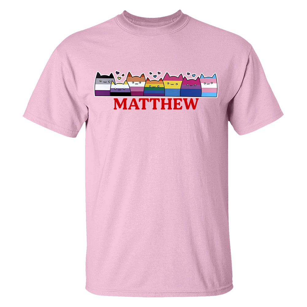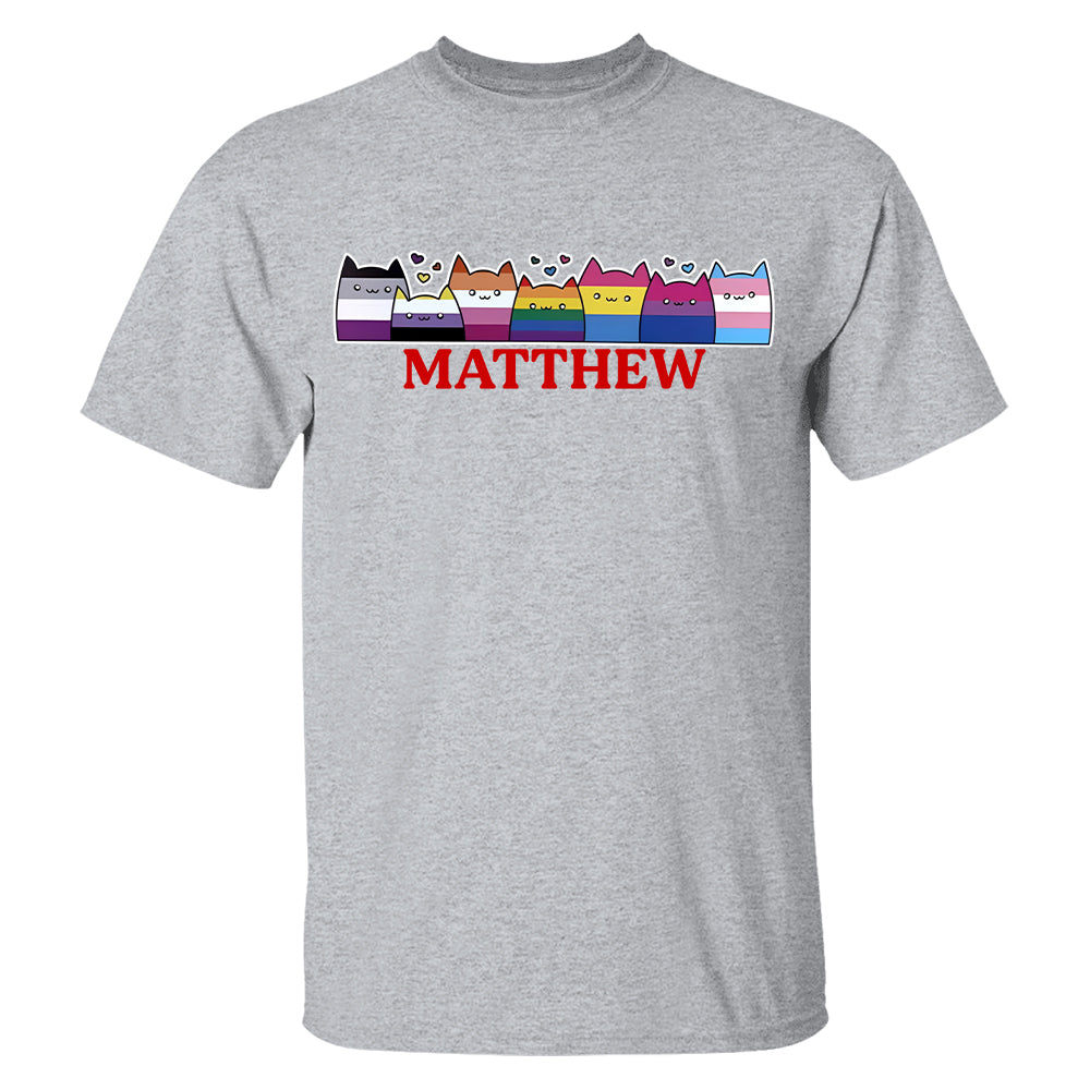 Celebrate who you are with style, personality, and pride! This Personalized LGBTQ+ Pride Cat T-Shirt features an irresistibly cute row of rainbow-colored cats, each representing a different pride flag — including asexual, bisexual, lesbian, gay, pansexual, nonbinary, and transgender identities. Designed to be inclusive, joyful, and full of personality, this shirt is a must-have for anyone who wants to express their identity in a fun, bold way. Best of all? It’s customized with your name (or a loved one’s), making it a one-of-a-kind gift or personal keepsake. Whether you're a member of the LGBTQIA+ community, an ally, or looking for a thoughtful and unique Pride Month gift, this shirt is designed to bring joy, visibility, and love to every wardrobe.