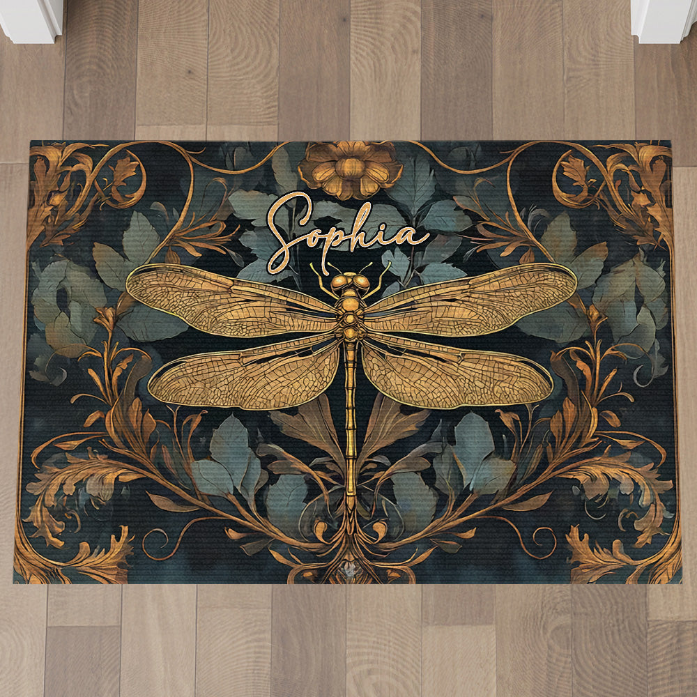 Welcome guests in style with this stunning Personalized Dragonfly Family Doormat, a perfect blend of elegance and charm. Featuring an intricately detailed golden dragonfly set against a rich floral backdrop, this piece is more than a doormat — it’s a statement. The baroque-inspired leaves and flower accents add a vintage touch, while the vibrant contrast of gold and dark tones ensures it stands out beautifully on any surface.