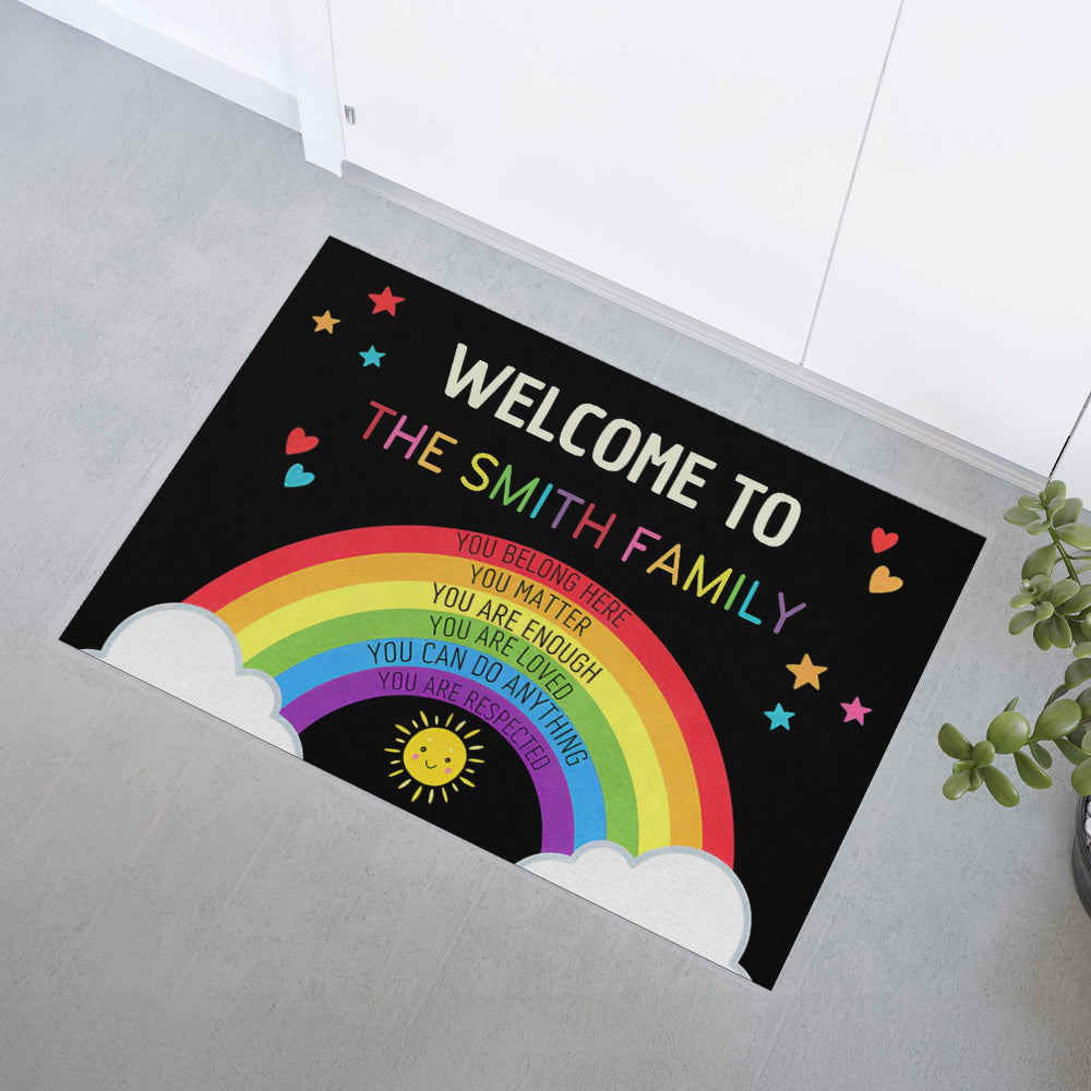 Create a warm, uplifting, and inclusive welcome for every guest with our Personalized Rainbow Welcome Doormat. Featuring a bold rainbow arch filled with positive affirmations — “You Belong Here, You Matter, You Are Enough, You Are Loved, You Can Do Anything, You Are Respected” — this vibrant design is topped with the words “Welcome To” and your custom family name in bright, cheerful colors. Crafted from durable, non-slip materials, this custom name welcome mat is perfect for both indoor and outdoor use. Its positive message and colorful design make it ideal for families, classrooms, businesses, and anyone who wants to spread kindness right at the doorstep. Spread joy, love, and acceptance with this personalized rainbow affirmation doormat. Order today and make your entryway a place where everyone feels welcome and valued!